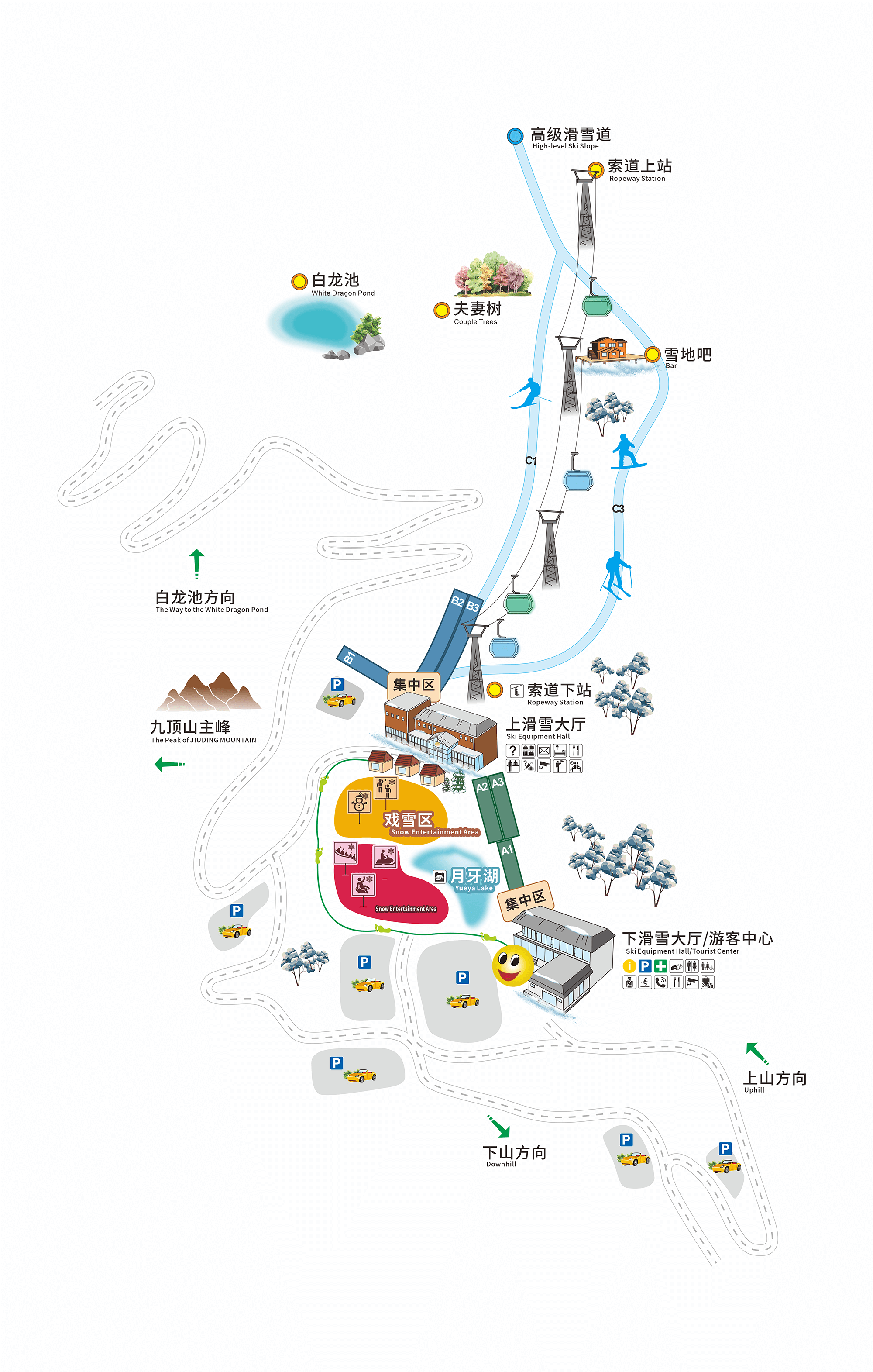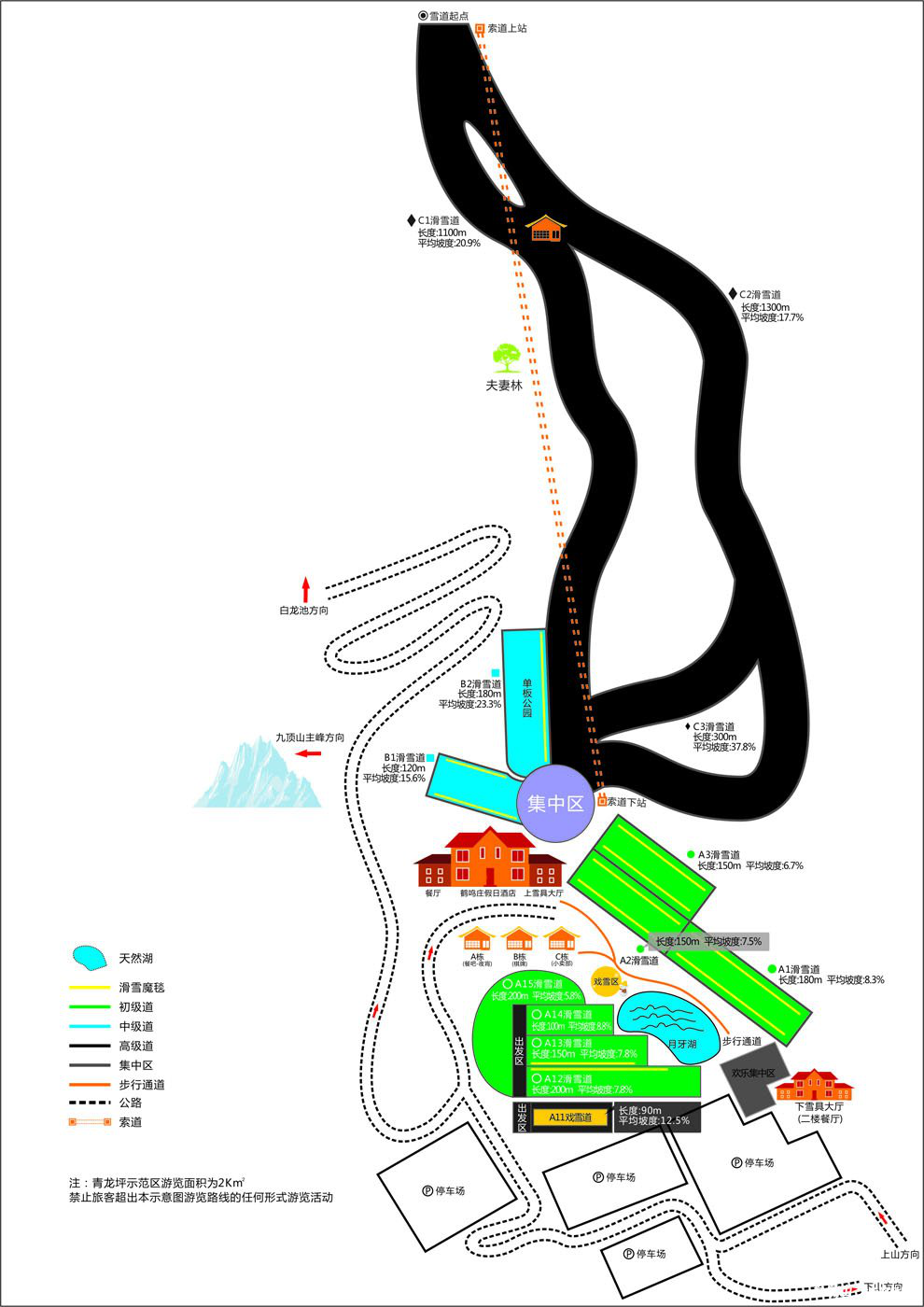 戏雪道3条,总长600米,坡度5.8%-12.5%。